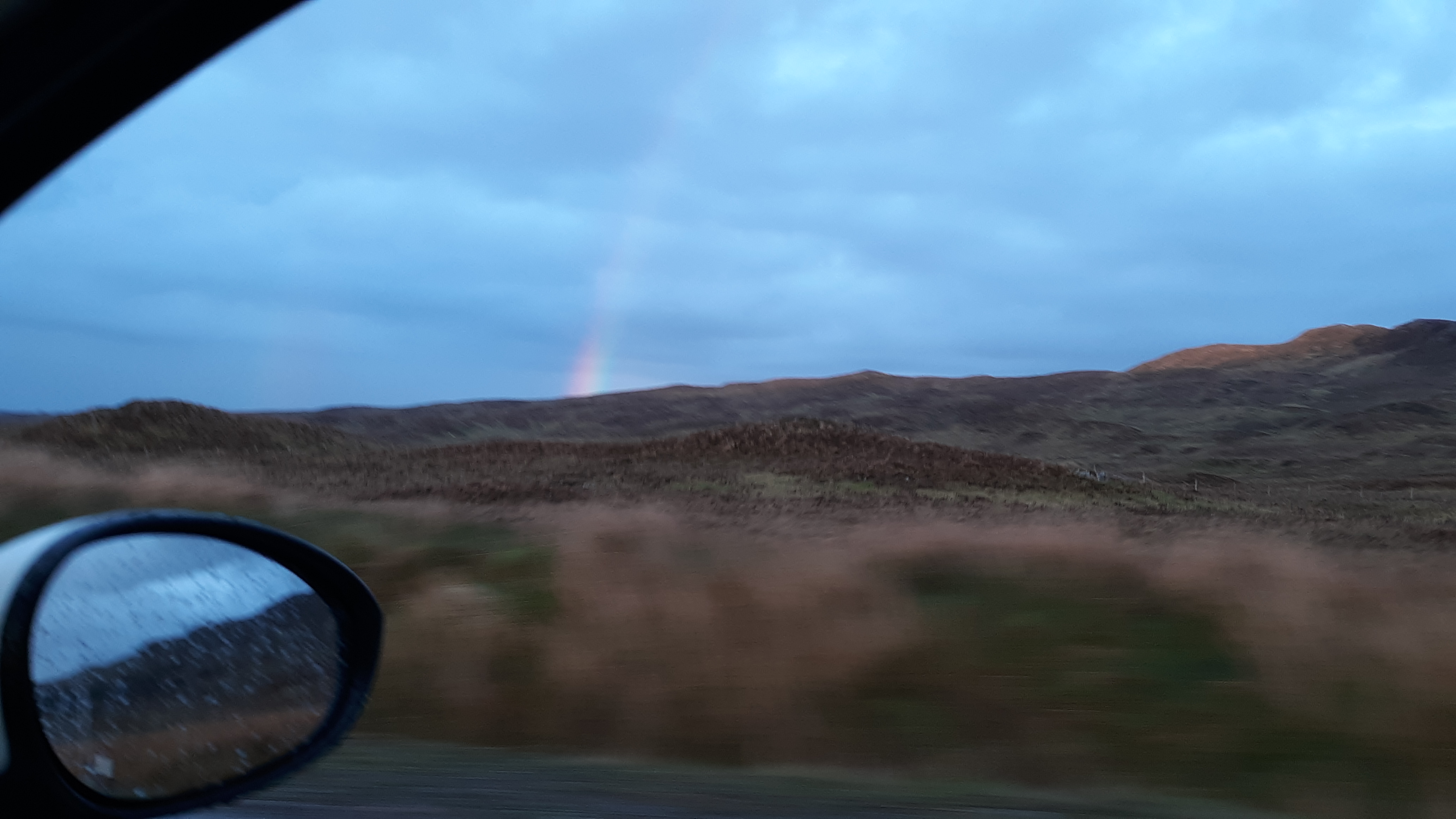 As soon as we were out of the car and began to pick our way through the boggy bits, Ben recognizes (edit:what he thought at the time was) Dumbledore’s filming location. (Post research note: it was still a magical place even if the cast and crew were actually on Loch Eilt). Not long after we spotted a small family group of deer. We ended up getting gas from the place I have seen in every YouTube video bout making your way to the highlands, The Green Welly Stop. From there, we drove through the moorlands. We were greeted with a “Welcome to the Highlands” sign and a double rainbow.